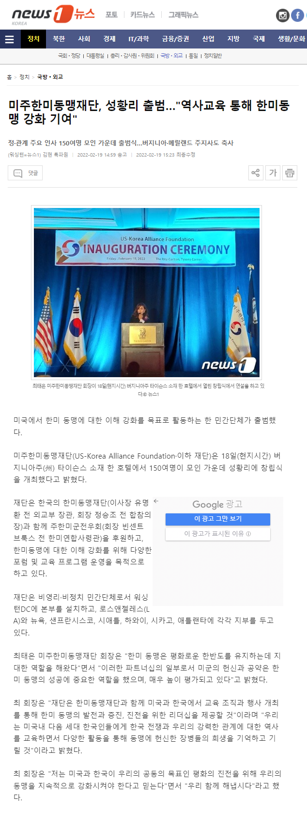 - next미주한미동맹재단 출범…"동맹 강화 다양한 사업 추진" 23.01.24