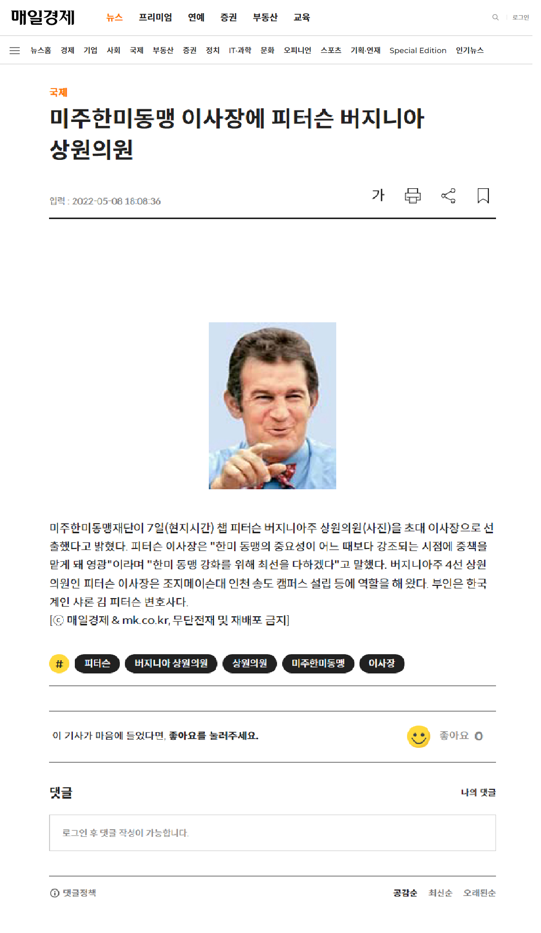 - next미주한미동맹, 피터슨 버지니아 상원의원 이사장 선출 23.01.24