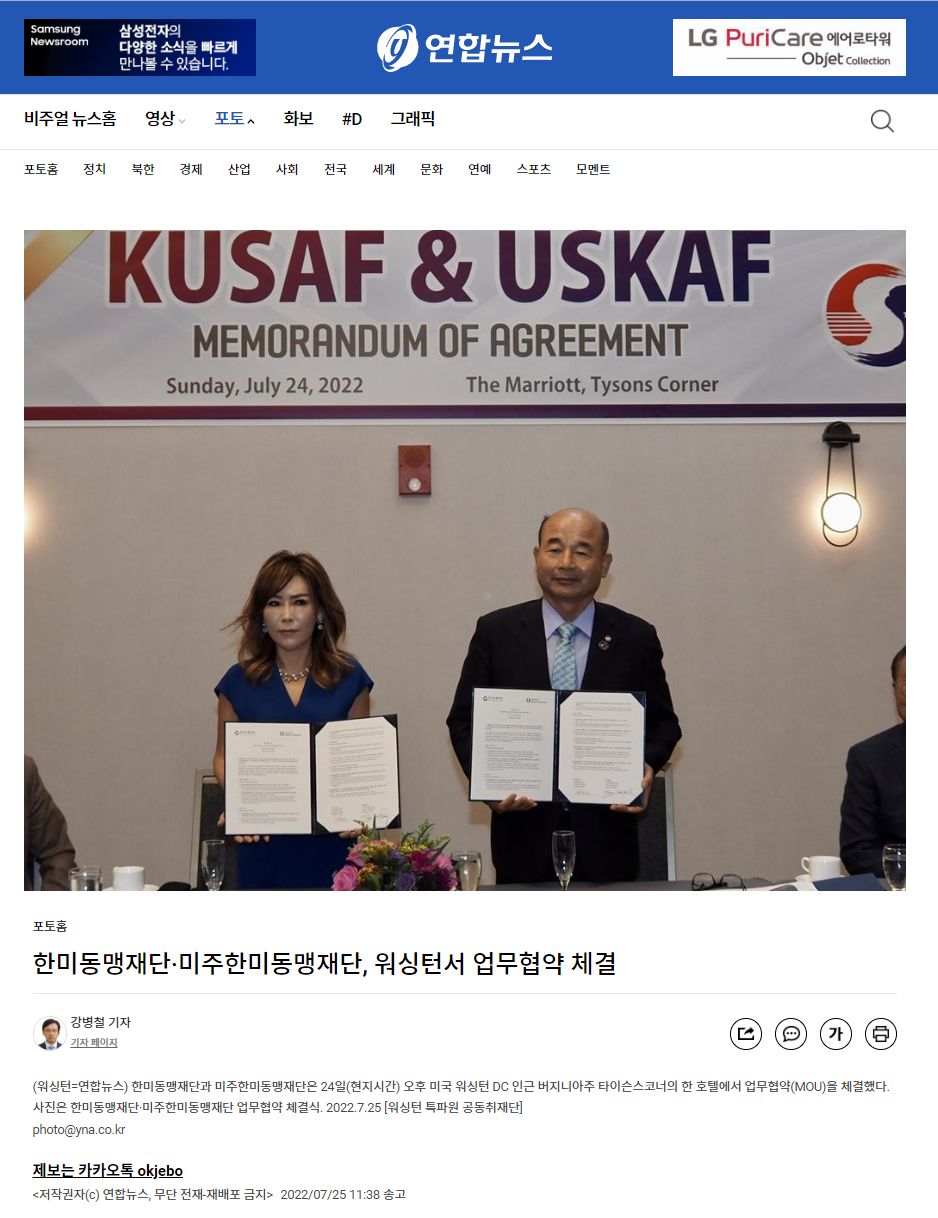 (워싱턴=연합뉴스) 한미동맹재단과 미주한미동맹재단은 24일(현지시간) 오후 미국 워싱턴 DC 인근 버지니아주 타이슨스코너의 한 호텔에서 업무협약(MOU)을 체결했다. 사진은 한미동맹재단·미주한미동맹재단 업무협약 체결식. 2022.7.25 [워싱턴 특파원 공동취재단]