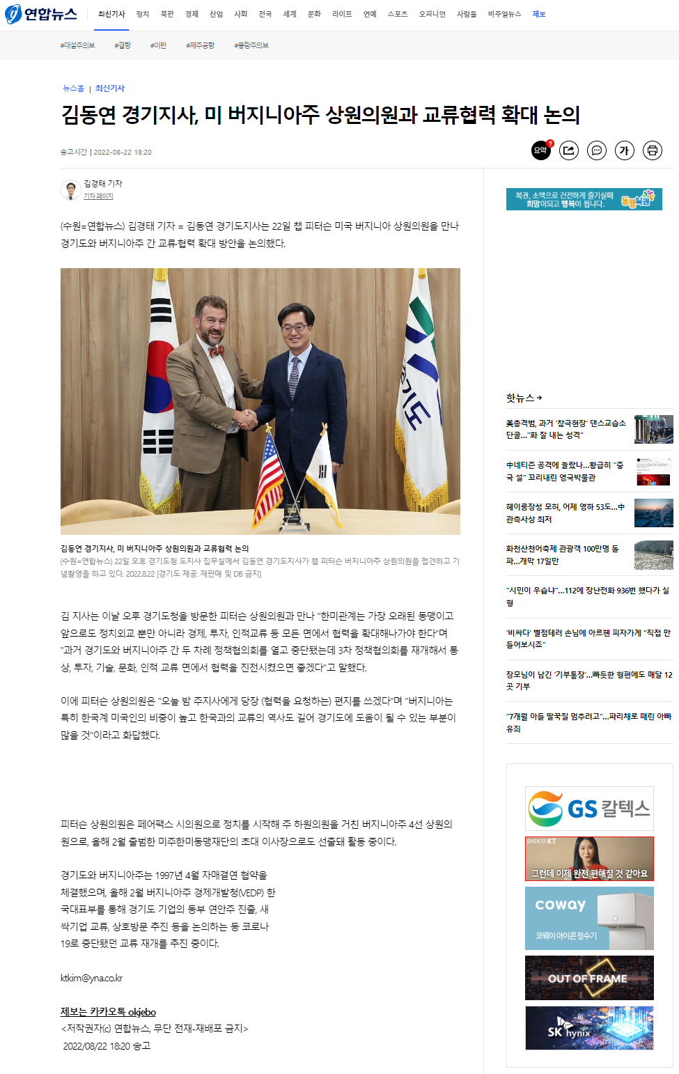(수원=연합뉴스) 김경태 기자 = 김동연 경기도지사는 22일 챕 피터슨 미국 버지니아 상원의원을 만나 경기도와 버지니아주 간 교류·협력 확대 방안을 논의했다.