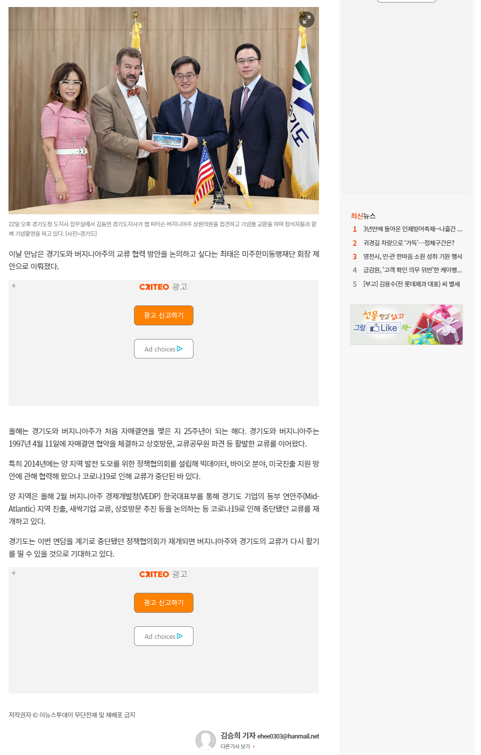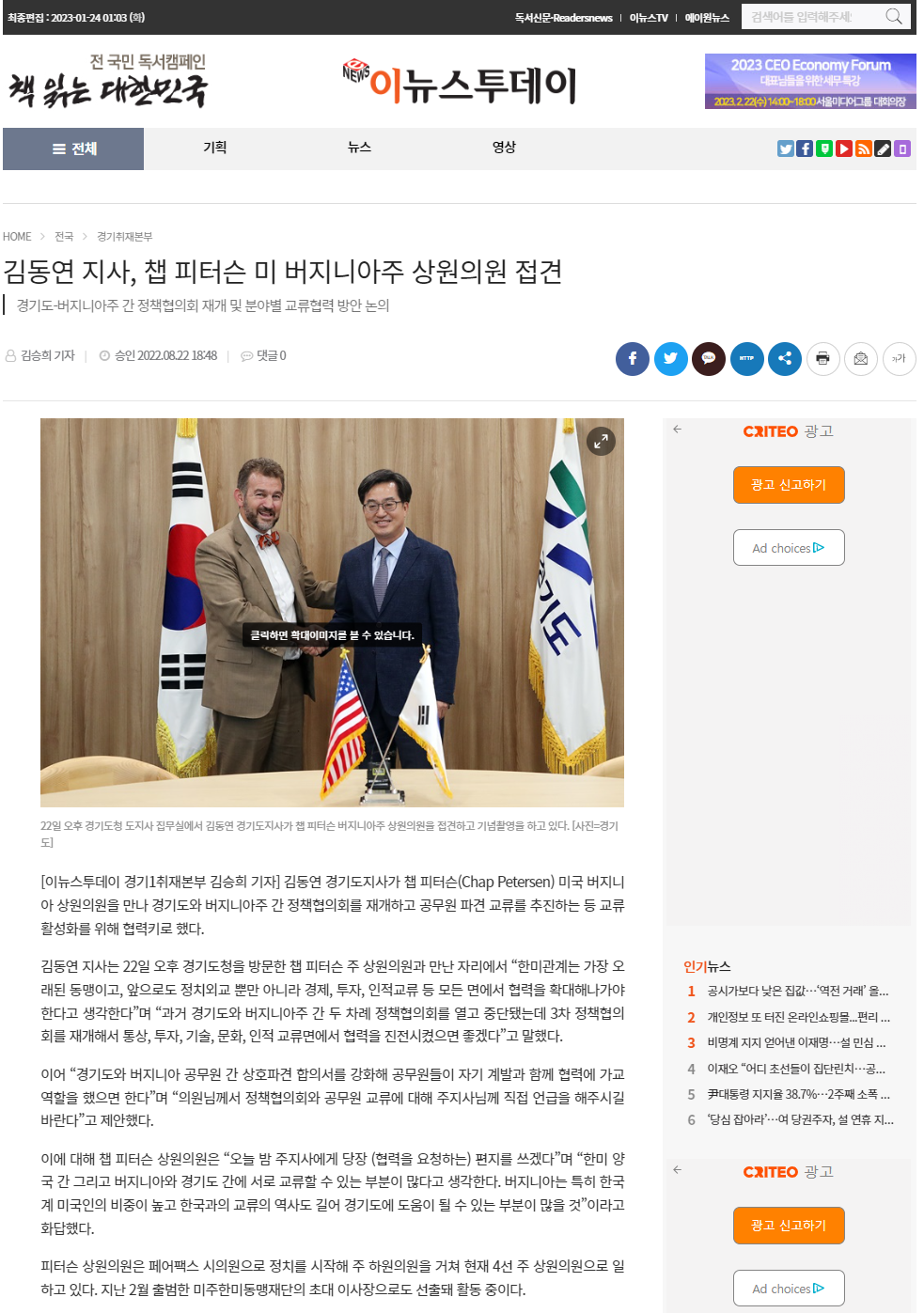 - prev김동연 지사, 챕 피터슨 미 버지니아주 상원의원과 교류 협력 논의 23.01.24