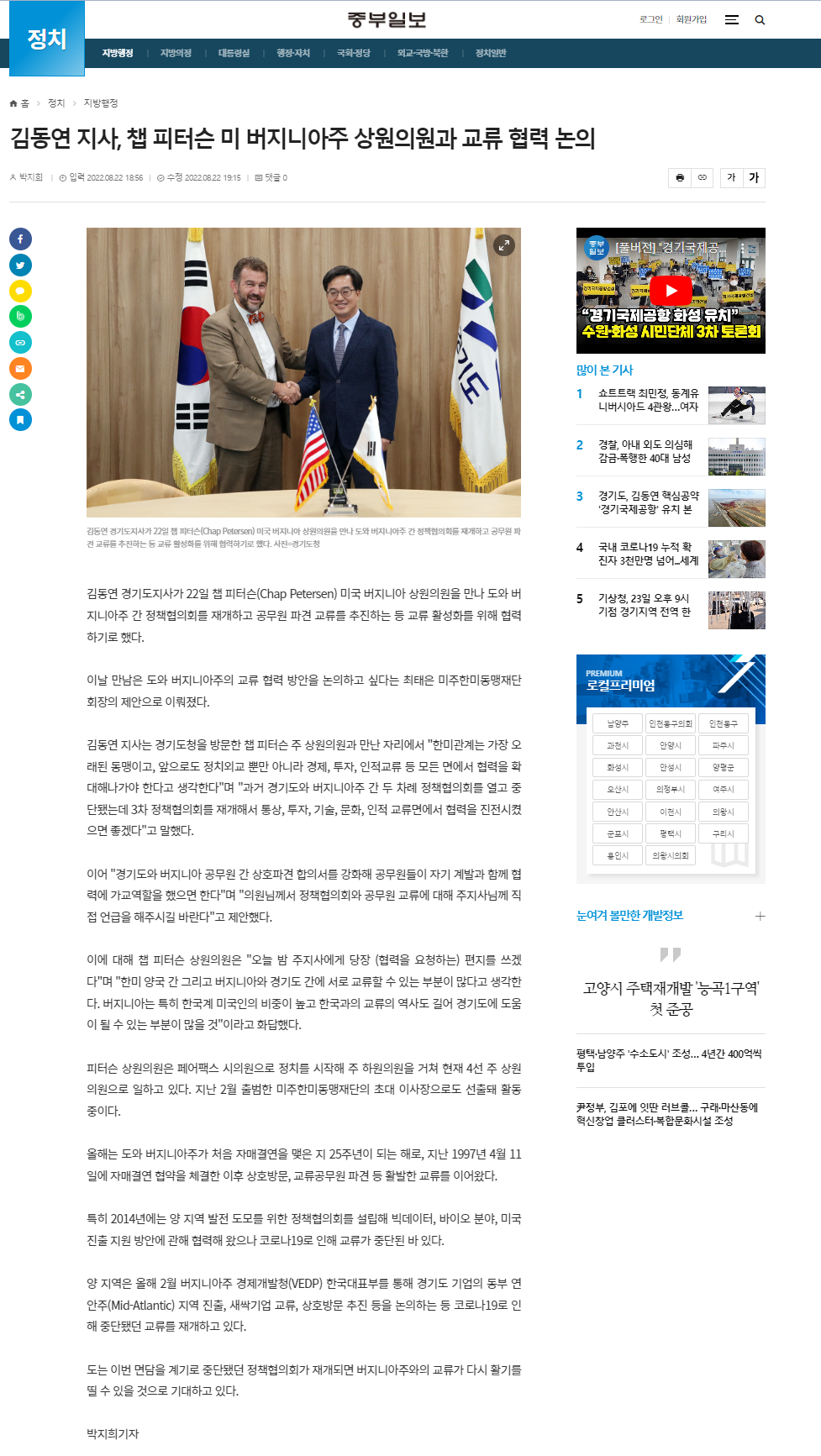 - prev김동연 경기도지사, 챕 피터슨 미 버지니아주 상원의원 면담...교류협력 확대 논의 (관련뉴스 18건) 23.01.24